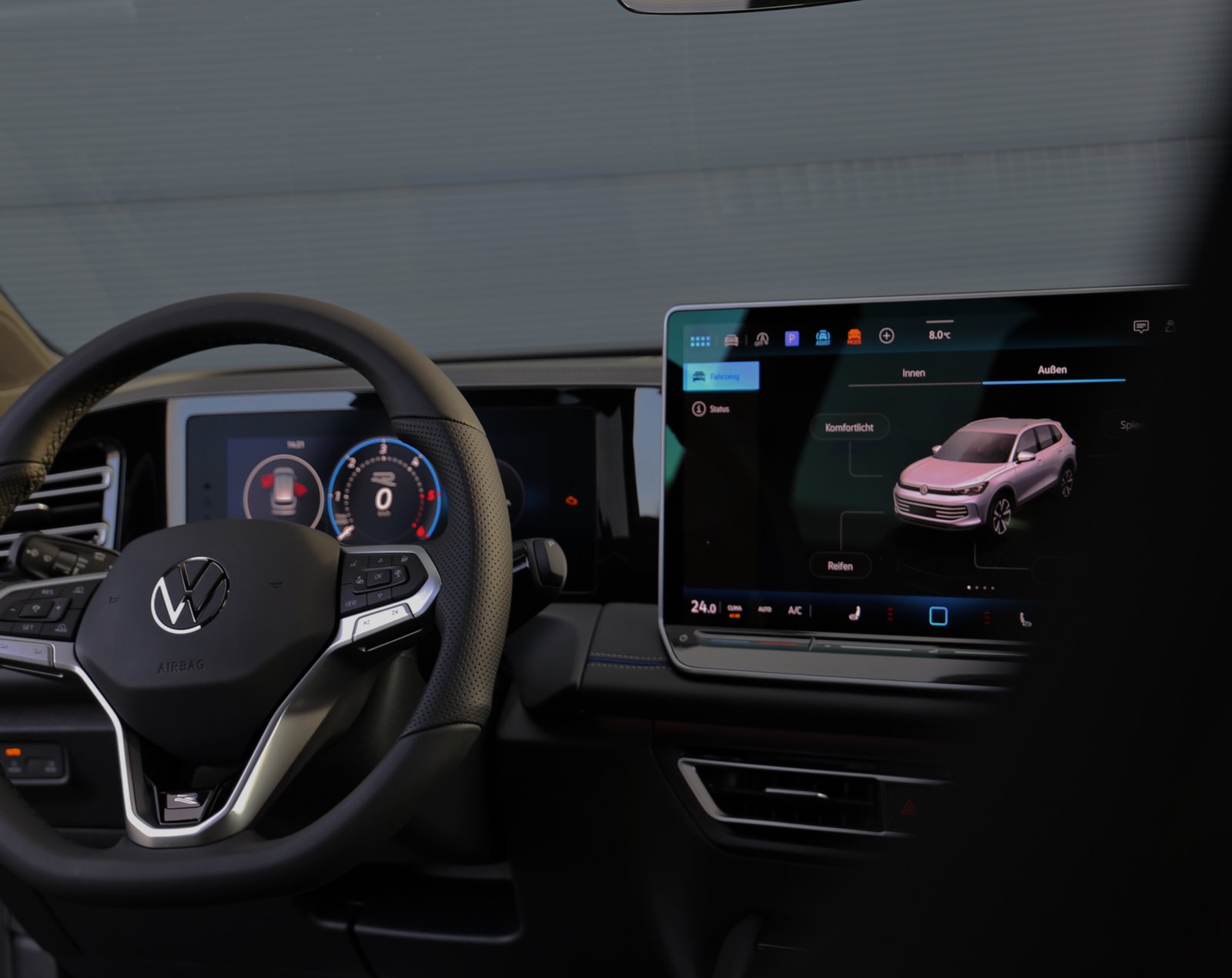 Der Volkswagen Tiguan R-Line 2024 in der Dieselversion vereint Leistung, Luxus und Stil in einem kompakten SUV. Angetrieben von einem 2,0-Liter-Turbodieselmotor mit 195 PS überzeugt er mit souveränem Durchzug und hoher Effizienz. Das sportliche R-Line Fahrwerk und das 7-Gang-DSG-Getriebe sorgen dabei für ein dynamisches und zugleich komfortables Fahrerlebnis. Mit markanten Styling-Elementen wie einem einzigartigen Frontstoßfänger und 19-Zoll-Rädern setzt der Tiguan R-Line ein starkes visuelles Statement. Innen erwarten Sie hochwertige Materialien, Ambientebeleuchtung und moderne Technologien wie das digitale Cockpit und kabelloses Apple CarPlay. Der Tiguan R-Line ist die ideale Wahl für alle, die auch bei einem Dieselantrieb nicht auf gehobenen Fahrkomfort verzichten möchten.
